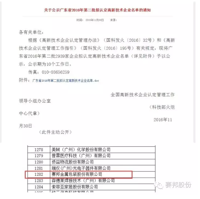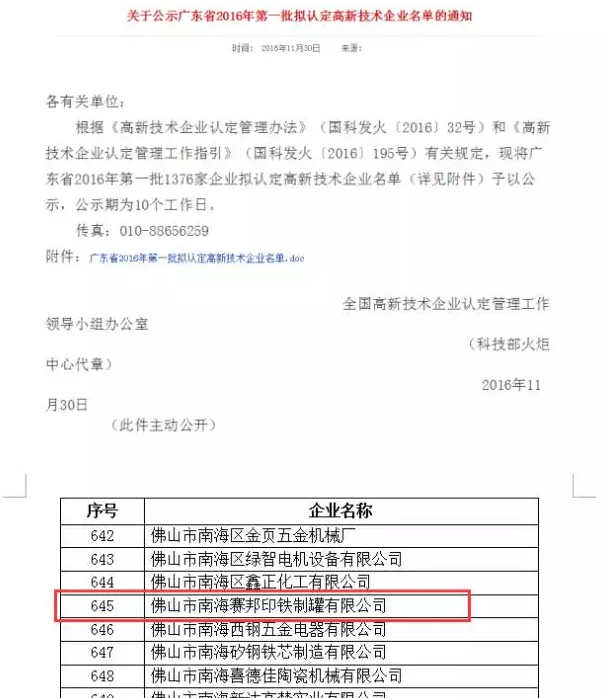 近日,廣東省科技廳在高新技術(shù)企業(yè)認(rèn)定管理工作網(wǎng)上公布了廣州市2016年第一、第二批認(rèn)定的高新技術(shù)企業(yè)名單,賽邦金屬包裝股份有限公司和佛山市南海賽邦印鐵制罐有限公司先后被認(rèn)定為高新技術(shù)企業(yè)。